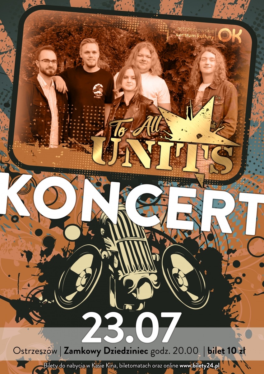 TO ALL UNITS - Zespół działa od roku 2017. Wykonuje muzykę z pogranicza szeroko pojętego alternatywnego pop-rock'a. Ma na koncie jeden autorski album zatytułowany "Gwiazdy", który wydany został w roku 2019. W ostatnim czasie w zespole zaszły pewne zmiany. Muzycy pożegnali się z dotychczasowym wokalistą, a froncie pojawiła się nowa osoba. Obecny skład zespołu: - Wiktoria Łacina - wokal - Błażej Ibron - gitara elektryczna - Jakub Szymankiewicz - instrumenty klawiszowe - Maciej Starczewski - gitara basowa - Patryk Stasiak - perkusja