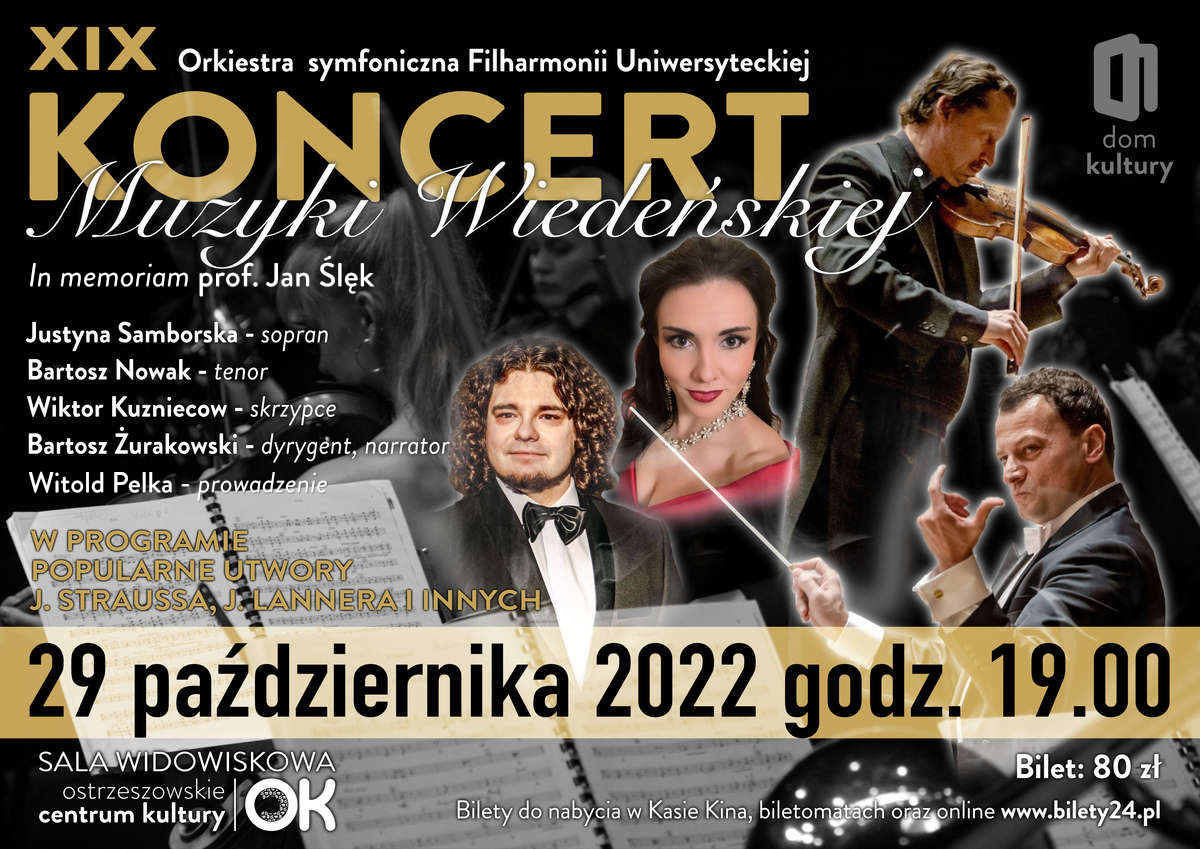 Wystąpi dla Państwa Orkiestra Symfoniczna Filharmonii Uniwersyteckiej oraz Justyna Samborska- sopran, Bartosz Nowak - tenor, Wiktor Kuzniecow – skrzypce, Bartosz Żurakowski - dyrygent. W programie utwory kompozytorów wiedeńskich: J. Straussa, J Lannera i innych. To niezywkłe wydarzenie poprowadzi Witold Pelka.