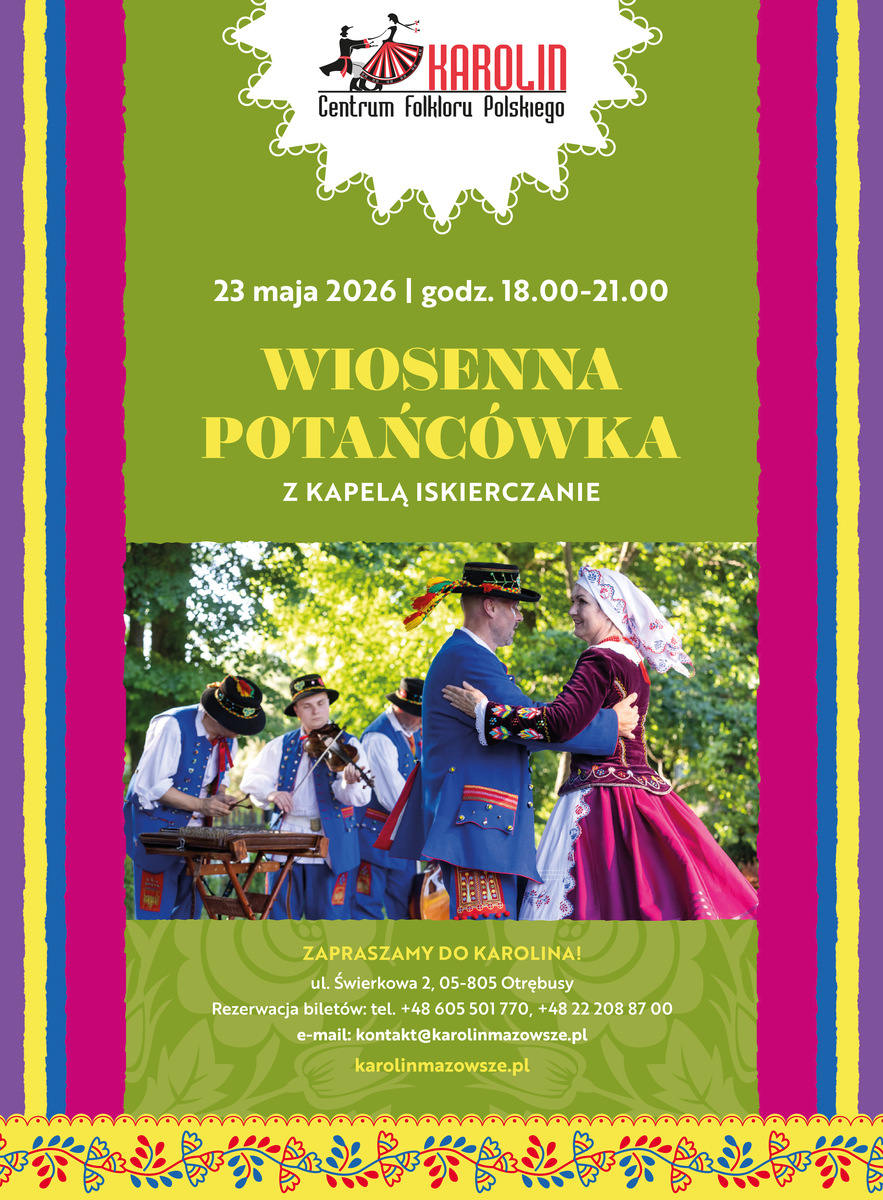 Wiosenna Potańcówka z Kapelą Iskierczanie 23.05.2026 18:00 W sobotę, 23 maja zapraszamy do Centrum Folkloru Polskiego „Karolin” na Wiosenną Potańcówkę. Do tańca zagra Kapela Iskierczanie a wesołe zabawy taneczne poprowadzą Ewa Leśniak i Marian Ciebiera. Poznamy kroki i figury tradycyjnych tańców z Podkarpacia. Zapraszamy do wspólnej zabawy przy muzyce na żywo! Kapela Iskierczanie Kapela Iskierczanie została założona w 2017 roku w Dębicy. Instrumentaliści inspirują się tradycyjną muzyką szeroko pojętej Rzeszowszczyzny. Czerpią z doświadczeń muzykantów, a także materiałów archiwalnych, skrywających bezkresne bogactwo kultury muzycznej przodków. Pragną również nawiązać do pierwotnego charakteru tej muzyki poprzez organizację oraz udział w tradycyjnych...