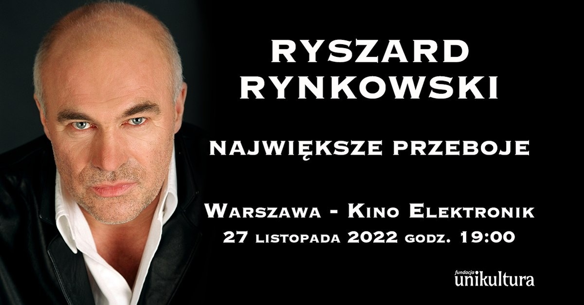 Fundacja Unikultura zaprasza na koncert Ryszarda Rynkowskiego w Kinie Elektronik (ul. gen. Józefa Zajączka 7 - przy stacji metra Dworzec Gdański) w Warszawie - 27 listopada 2022 o godz. 19:00.