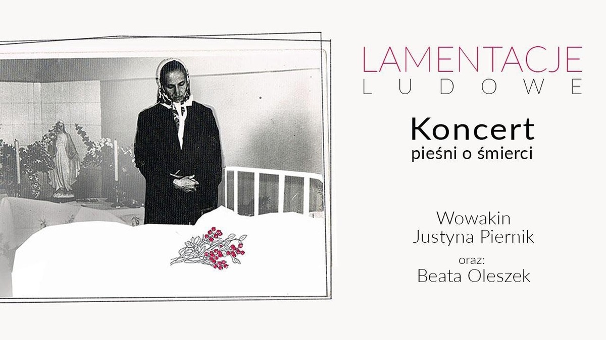 Organizator: Radiowe Centrum Kultury Ludowej Wykonawcy: Zespół Wowakin w składzie: Paula Kinaszewska, Mateusz Wachowiak, Bartłomiej Woźniak oraz Justyna Piernik, Beata Oleszek Lamentacje to próba przeniesienia starych ludowych pieśni, wykonywanych przeważnie a'capella w realia muzycznego koncertu z wykorzystaniem głosu i tradycyjnych instrumentów takich jak skrzypce, basy, cymbały oraz elektroniki przetwarzającej dźwięk. "Lamentacje" - koncert oparty na zabytkowych przepięknych pieśniach pasyjnych, zebranych m.in. w Śpiewniku Pelplińskim, ale także przejętych od wybitnych śpiewaczek i śpiewaków ludowych- m.in. Marii Siwiec, Anieli Gmoch, Beaty Oleszek i innych. Są to niezwykłe przykłady literatury barokowej i starszej, które przeniknęły...