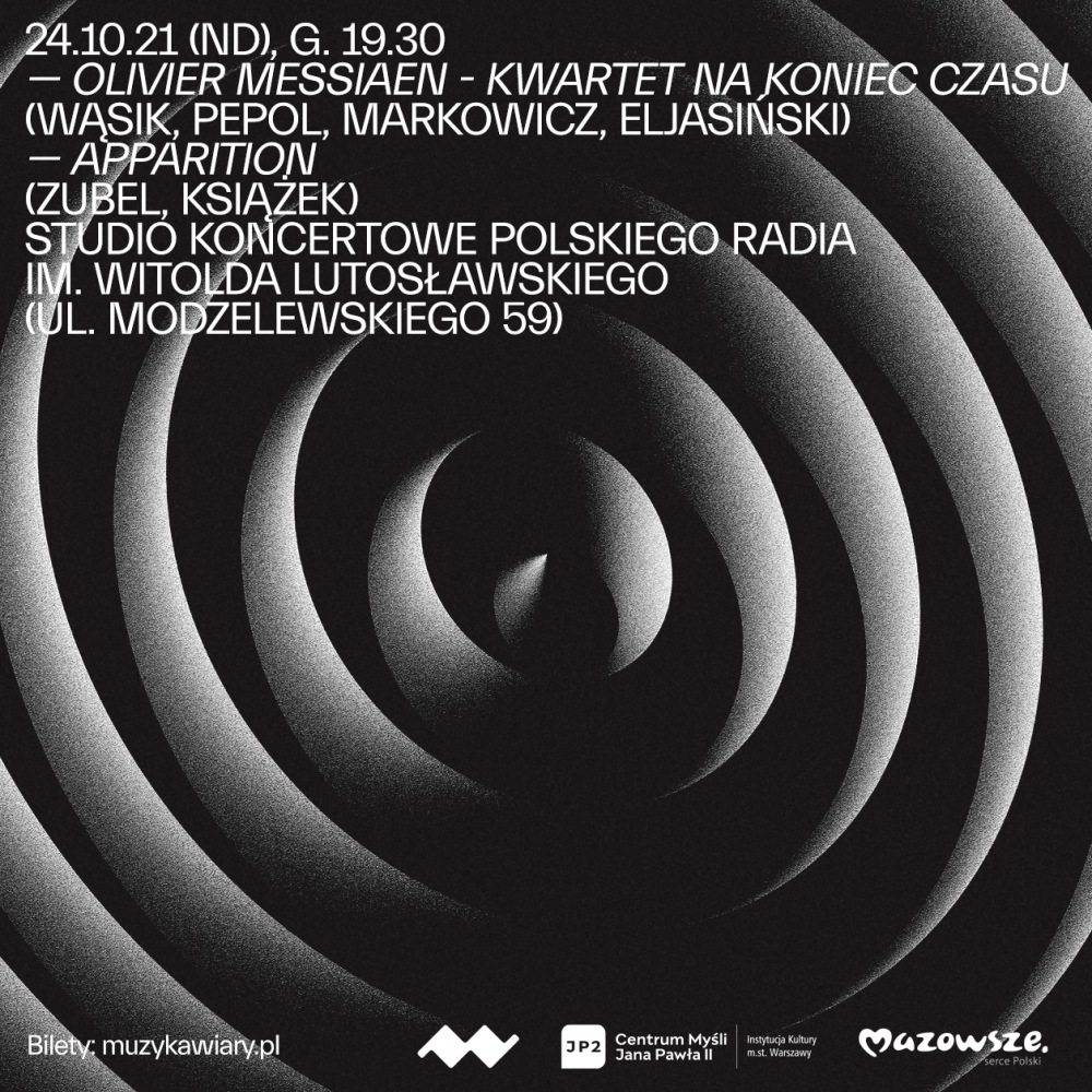 Organizatorzy: Centrum Myśli Jana Pawła II, Program 2 Polskiego Radia Wykonawcy: Bartek Wąsik fortepian Adam Eljasiński klarnet Marcin Markowicz skrzypce Michał Pepol wiolonczela Agata Zubel wokal Krzysztof Książek fortepian W programie: Olivier Messiaen - „Kwartet na koniec czasu” Repertuar z płyty „Apparition” „Kwartet na koniec czasu” Oliviera Messiaena to jeden z najbardziej znaczących utworów kameralnych XX wieku – dzieło mistyczne, natchnione i bogate w niebanalne, piękne melodie. Jest to utwór otoczony legendą – młody Messiaen stworzył go w 1940 roku w niewoli, w niemieckim stalagu na Dolnym Śląsku. Jego prawykonanie odbyło się 15 stycznia 1941 roku w obozie, pod gołym niebem, przed tłumem internowanych żołnierzy. Minęło zatem okrągłe...