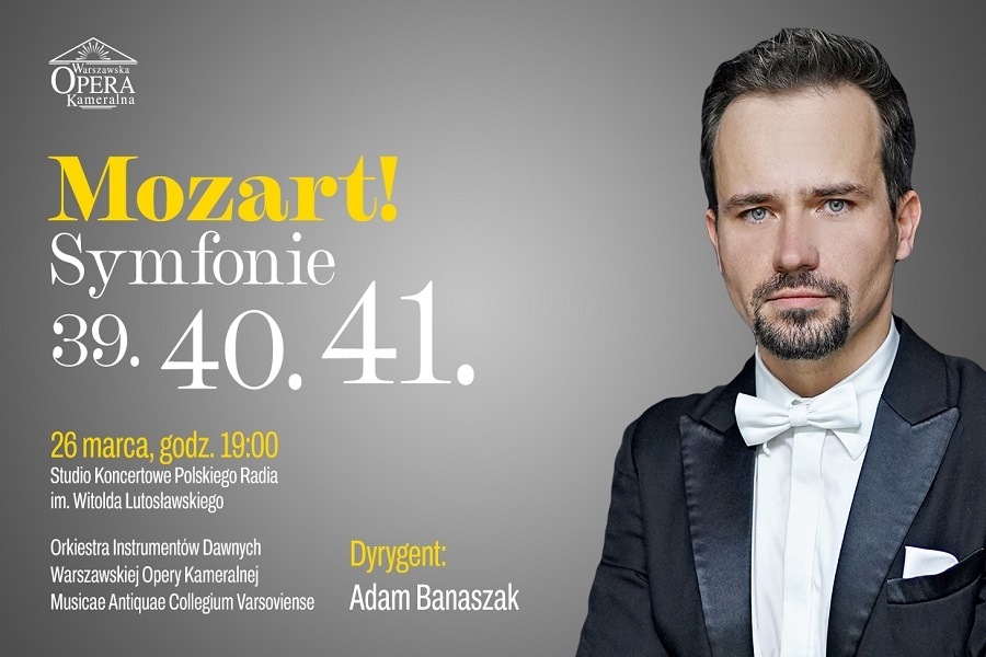 Organizator: Warszawska Opera Kameralna Wykonawcy: Orkiestra Instrumentów Dawnych Warszawskiej Opery Kameralnej Musicae Antiquae Collegium Varsoviense Adam Banaszak dyrygent Program: Trzy ostatnie symfonie Mozarta 39. Symfonia Es-dur (KV 543) 40. Symfonia g-moll (KV 550) 41. Symfonia C-dur (KV 551) Stefan Jarociński: Wszystko tu toczy się z niesłychaną siłą inwencji: po romantycznie uroczystym Adagio rozwija się od razu płynące śpiewnie Allegro; po nim przychodzi poetyckie Andante, zakończone dwoma ostrymi akordami całej orkiestry; z kolei słynny, pełen gracji Menuet stwarza swym wyrazistym rytmem kontrast z pojawiającym się tuż po nim trio, gdzie klarnet prostą i czułą kantyleną wyczarowuje całą słodycz duszy Mozarta; wreszcie wartkie Allegro...