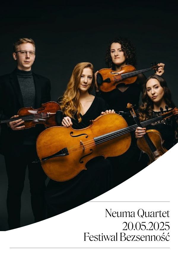 To już dziewiąta edycja Festiwalu Bezsenność! Tradycyjnie w maju zapraszamy do Bazaru Poznańskiego na pięć niezwykłych wieczorów z kameralistyką z charakterem. Sławomira Wilga (skrzypce), Michał Nowak (skrzypce), Nela Zaforemska (altówka) i Agata Nowak (wiolonczela) tworzą kwartet, który od momentu powstania zdobywa uznanie zarówno na polskiej, jak i międzynarodowej scenie muzycznej. Punktem wyjścia artystycznej drogi zespołu był koncert u boku Leonory Armellini, laureatki XVIII Międzynarodowego Konkursu Pianistycznego im. Fryderyka Chopina. To wyjątkowe wydarzenie – inauguracja XXI Międzynarodowego Konkursu Muzyki Kameralnej im. Kiejstuta Bacewicza w 2022 r. – stało się impulsem do powołania zespołu, który obrał za cel odkrywanie głębi kameralnej...