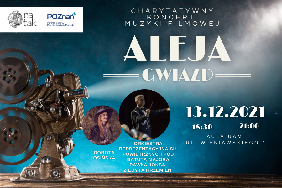 Koncert świąteczny pt.: Aleja Gwiazd to wyjątkowe wydarzenie podczas którego Orkiestra Reprezentacyjna Sił Powietrznych z Poznania pod dowództwem majora Pawła Joksa wraz z wokalem Edyty Krzemień zabierze nas w świat muzyki filmowej. Ponadto Dorota Osińska z zespołem zaprezentuje nam dźwięki z Oskarowych produkcji, a całość poprowadzi znany dziennikarz Tomasz Wolny. Święta to nie tylko czas zimowej radości, ale także czas dzielenia się tym co mamy, dlatego dochód z biletów koncertowych oraz dochód z prowadzonej podczas wydarzenia licytacji zostanie przeznaczony na rzecz podopiecznych Stowarzyszenia Na Tak – osób z niepełnosprawnością intelektualną. Zapraszamy do wspólnego przeżywania magii zimy, w całej jej okazałości.