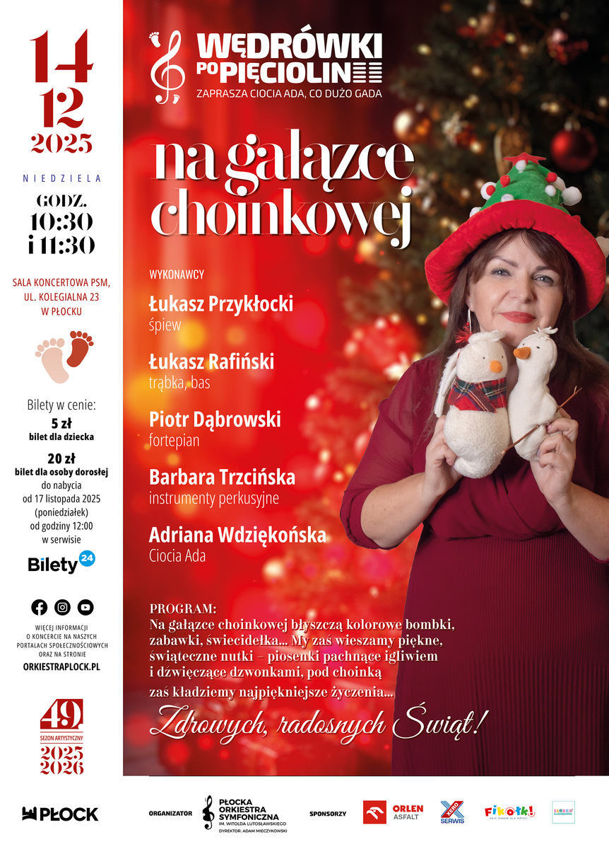 14 grudnia 2025, godz. 10:30 i 11:30 sala koncertowa PSM, ul. Kolegialna 23 WĘDRÓWKI PO PIĘCIOLINII NA GAŁĄZCE CHOINKOWEJ Wykonawcy: Olga Gwizdała – śpiew Łukasz Rafiński – trąbka, bas Piotr Dąbrowski – fortepian Barbara Trzcińska – instrumenty perkusyjne Adriana Wdziękońska – Ciocia Ada Na gałązce choinkowej błyszczą kolorowe bombki, zabawki, świecidełka… My zaś wieszamy piękne, świąteczne nutki – piosenki pachnące igliwiem i dźwięczące dzwonkami, pod choinką zaś kładziemy najpiękniejsze życzenia… Zdrowych, radosnych Świąt! Bilety w cenie: - 5 zł bilet dla dziecka - 20 zł bilet dla osoby dorosłej do nabycia od 17 listopada 2025 (poniedziałek) od godziny 12:00 w kasie biletowej POS oraz w serwisie Bilety24.pl******* Bezpieczne zakupy w...