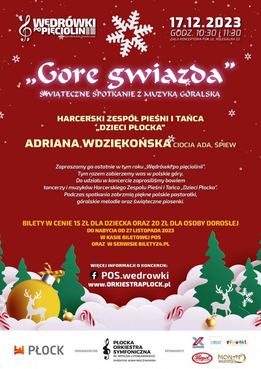Zapraszamy na ostatnie w tym roku „Wędrówki po pięciolinii”. Do udziału w koncercie zaprosiliśmy bowiem tancerzy i muzyków Harcerskiego Zespołu Pieśni i Tańca „Dzieci Płocka”. Podczas spotkania zabrzmią piękne polskie pastorałki, ludowe melodie oraz świąteczne piosenki.