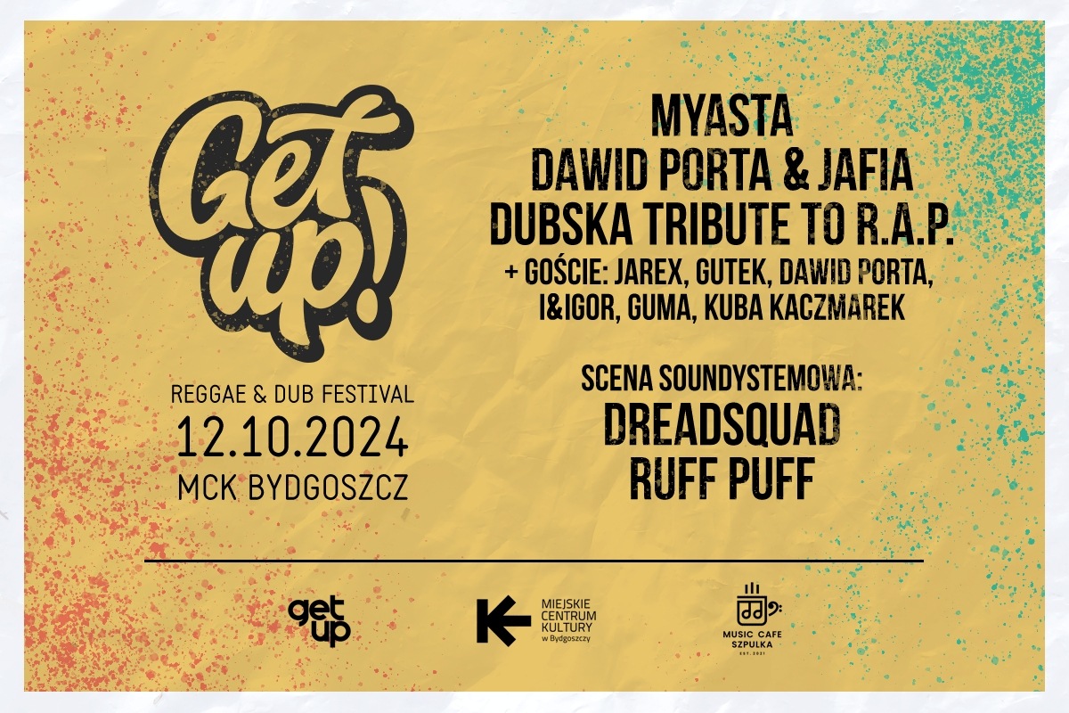 UWAGA: Koncert godz. 19:00, otwarcie bramek 18:00 Get Up Bydgoszcz 2024 to święto muzyki reggae w Bydgoszczy! Zapraszamy serdecznie na siódmą edycję Get Up Bydgoszcz Festiwal! Jak w poprzednio spotykamy się w Miejskim Centrum Kultury w Bydgoszczy już 12.10.2024! Koncerty rozpoczniemy naszym lokalnym "czarnym koniem", czyli Myasta! Ośmioosobowa ekipa, która łączy reggae z hip-hopem, dubem i raggamuffin. Swój debiutancki album "Na dobrym kursie" wydali zwyciężając w radiowym konkursie „Wydaj płytę z Będzie Głośno” na antenie Czwórki. W tej chwili są w trakcie nagrywania materiału na drugi album. Następnie na scenie zagości Dawid Porta & Jafia! Tego składu fanom reggae przedstawiać nie trzeba. Jafia w tym roku świętuje 30-lecie i tym bardziej...