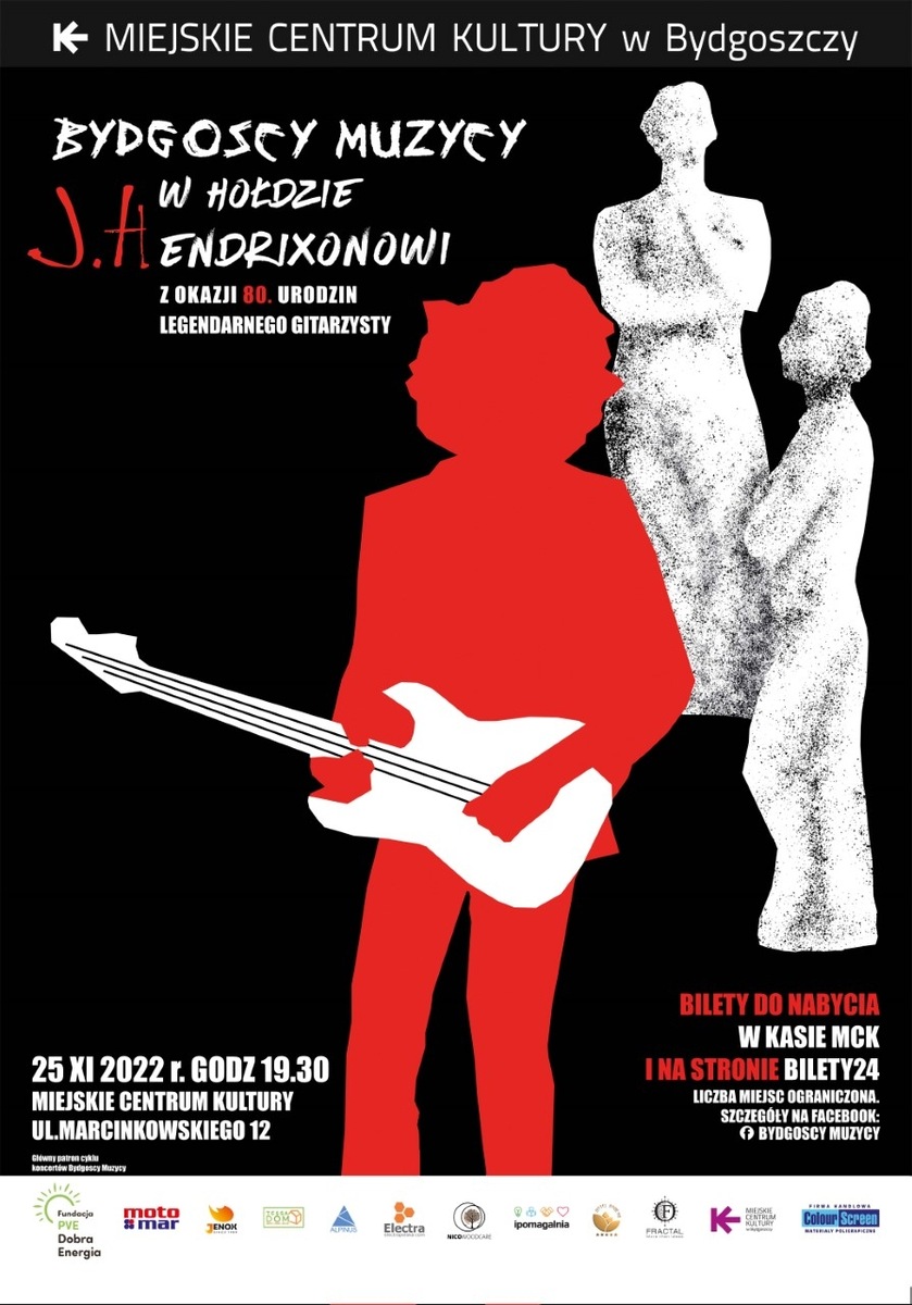 Bydgoscy Muzycy w Hołdzie J. Hendrixa data: 25.11.2022 godz: 19:30 miejsce: Miejskie Centrum Kultury w Bydgoszczy Bydgoscy Muzycy zapraszają 25 listopada na elektryczną ucztę gitarową z okazji 80. urodzin Jimiego Hendrixa Ceny biletów: Do 18.11.2022 - 40zł Od 19-24.11.2022 - 50zł w dniu - 60zł Zapraszamy! Bilety dostępne również w kasie MCK*******