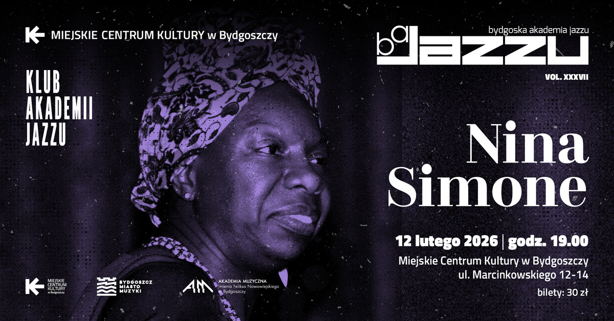 Data: 12 lutego 2026 r., godzina 19:00 Miejsce: Miejskie Centrum Kultury w Bydgoszczy (ul. Marcinkowskiego 12-14) Bilety: 30 zł ___________________________________ Klub Akademii Jazzu vol XXXVII – Nina Simone Zapraszamy na koncert poświęcony twórczości jednej z najbardziej charyzmatycznych postaci w historii muzyki – genialnej pianistki, wokalistki i niepokornej aktywistki, Niny Simone. „Jazz to białe określenie na czarną muzykę. Moja muzyka to czarny klasyczny blues” – mawiała artystka, której głos stał się symbolem walki o wolność i godność. Tego wieczoru wspólnie zanurzymy się w jej niezwykłym świecie: pełnym surowych emocji, głębokiego soulu i wyrafinowanej klasyki. Będzie to fascynująca podróż przez dorobek „Arcykapłanki Soulu”,...