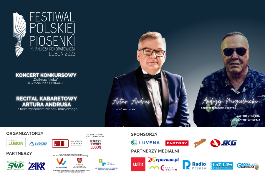 Zapraszamy na Koncert Konkursowy „Dotknąć nieba" o Grand Prix Festiwalu, który odbędzie się 29 września 2023 roku w hali LOSIR przy ul. Kołłątaja 2 w Luboniu. Usłyszymy kolejne piękne utwory, ważne teksty – te już znane oraz całkiem nowe, tworzone specjalnie dla organizowanego w ramach konkursu „Pióra Poetów”. Udział w wieczorze to gwarancja niezwykłych, muzycznych uniesień. Uczestnicy festiwalu tym razem zaprezentują się w piosenkach, do których tekst napisał Andrzej Mogielnicki - polski autor tekstów, piosenek, producent, członek Akademii Fonograficznej Związku Producentów Audio-Video, współzałożyciel zespołu Lady Pank. Do udziału w części konkursowej festiwalu zakwalifikowało się ostatecznie 13 wokalistów i wokalistek z całej Polski....