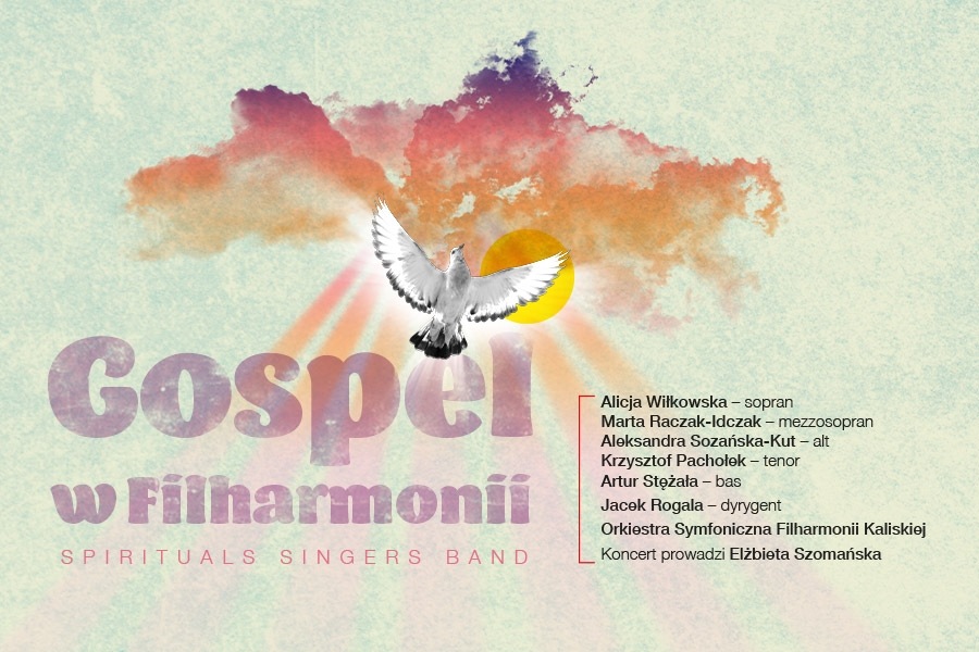 Doskonałe połączenie pieśni gospel z brzmieniem orkiestry symfonicznej w jazzowych aranżacjach Włodka Szomańskiego. WYKONAWCY: Spirituals Singers Band:Alicja Wiłkowska - sopran Marta Raczak -Idczak-mezzosopran Aleksandra Sozańska - Kut - alt Krzysztof Pachołek - tenor Artur Stężała - bas. Koncert prowadzi Elżbieta Szomańska Jacek Rogala - dyrygent Orkiestra Symfoniczna Filharmonii Kaliskiej*******