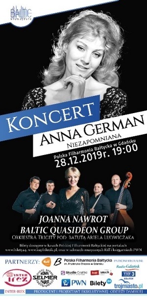 Koncert piosenek z repertuaru Anny German, Białego Anioła piosenki, z pewnością przeniesie słuchaczy w świat klasycznej piosenki, w nowych, niezwykłych aranżacjach i interpretacji wybitnych artystów, znanych w kraju i za granicą. Gwiazdą wieczoru będzie Joanna Nawrot, znana w w Polsce i na świecie jako jedna z najlepszych interpretatorek twórczości Anny German, która ponadto jest śpiewaczką klasyczną. Wystąpi wraz z zespołem Baltic Quasideon Group w składzie wybitnych, uznanych artystów : Andrzej Wojciechowski - klarnet, Jarosław Stokowski - kontrabas, Paweł Zawada - fortepian, Grzegorz Lewandowski - perkusja oraz Orkiestra Kameralna pod dyrekcją Ariela Ludwiczaka.