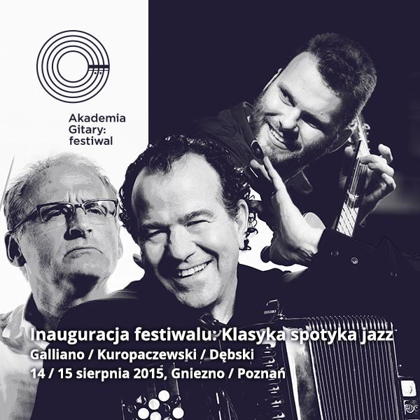 Akademia Gitary: festiwal ma zaszczyt zaprosić Państwa na koncert: Klasyka spotyka jazz: Galliano / Kuropaczewski / Dębski VIII edycja Akademii Gitary rozpocznie się wyjątkowym muzycznym dialogiem. Wybitny polski gitarzysta klasyczny, Łukasz Kuropaczewski, zagra w duecie z jednym z najsłynniejszych akordeonistów europejskich – Richardem Galliano. Koncert inaugurujący festiwal będzie nie tylko spotkaniem artystów, ale również różnorodnych muzycznych nurtów. Richard Galliano należy do grona najbardziej uznanych europejskich instrumentalistów i współczesnych kompozytorów. Swoje inspiracje czerpie w dużej mierze z jazzu, jaki również z muzyki klasycznej i etnicznej. Jako pierwszy wprowadził akordeon do świata jazzowej improwizacji. Różnorodność...