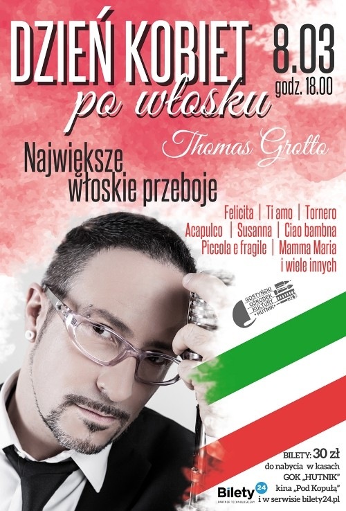 Thomas Grotto to wszystko co w Iatlii jest najlepszego: pasja, wigor i optymizm. Klasyczny włoch pełen żywiołowośći i temperamentu. Od najmłodszych lat koncertował we Włoszech, Niemczech, Austrii. A teraz dostępny jest dla polskiej publiczności! Jego drugą pasją widoczną na scenie jest tanie - salsy uczył się w Kolumbi i na Dominikanie. W Gostyniu zaprezentuje największe włoskie przeboje: Felicita, Ti amo, Tornero, Acapulco, Susanna.
