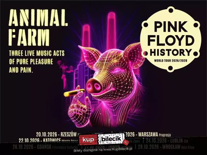 Po znakomicie przyjętej trasie w 2025 roku, włoski zespół PFH powróci w październiku 2026 roku do Polski kolejny koncerty. Tym razem światowa trasa rozpocznie się w Polsce. Z okazji 50 rocznicy wydania albumu ,,Animals", zespół zaprezentuje nowy program. Przygotuj się na muzyczną ucztę. PINK FLOYD HISTORY ,,Animal Farm Three Live Music Acts Of Pure Pleasure And Pain - World Tour 2026-2028"