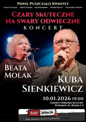Koncert Kuby Sienkiewicza i Beaty Molak z towarzyszeniem zespołu Pawła Puszczało i w jego aranżacjach. Oboje wykonawcy to ikony polskiej estrady, gwarantują publiczności doskonałą zabawę przy muzyce wykonanej przez zawodowych muzyków:Paweł Puszczało - kontrabas, gitara basowa,Marcin Partyka - instrumenty klawiszowe,Tomasz Boruch - gitary,Przemysław Skałuba - klarnet, saksofon,Karol Domański - perkusja. Zapraszamy do Gminnego Ośrodka Kultury w Wydminach.
