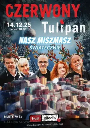 Czerwony Tulipan serdecznie zaprasza na wyjątkowe wydarzenie w świątecznym klimacie! Zespół z 40-letnim doświadczeniem zaprezentuje program "Nasz Miszmasz". Koncert jubileuszowej trasy 2025 roku. Nie przegap okazji, aby usłyszeć największe przeboje. Bilety w cenie 70 zł dostępne na kupbilecik.pl oraz w Sowie od czwartku do niedzieli po godzinie 17. Do zobaczenia na koncercie!