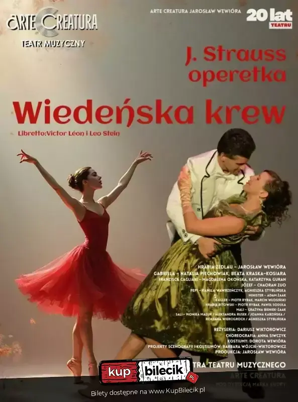 Jako jedyny w Polsce Arte Creatura Teatr Muzyczny zaprasza na roztańczoną "Wiedeńską krew" Króla Walca! Znakomita obsada Solistów Śpiewaków, doskonała Orkiestra Arte Creatura Teatru Muzycznego pod dyrekcją uznanych Dyrygentów, pełny III aktowy spektakl, gustowne kostiumy, cudowne głosy, gorąca wiedeńska krew i Najpiękniejsze Wiedeńskie Walce!