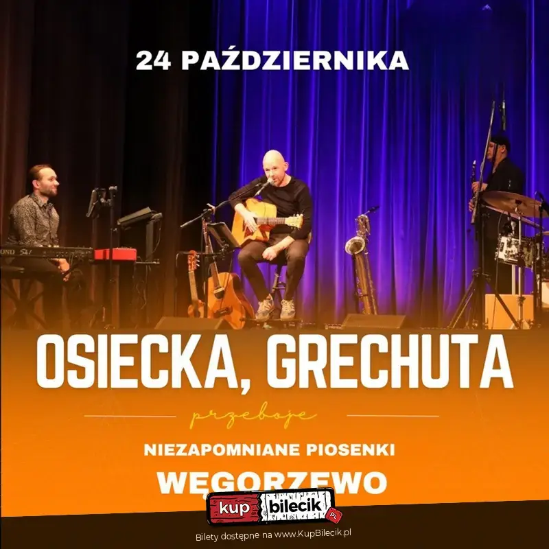 Zapraszamy na koncert poświęcony twórczości Agnieszki Osieckiej oraz Marka Grechuty. W programie znajdą się najwybitniejsze, najbardziej znane piosenki napisane przez Agnieszkę Osiecką: m.in. "Piosenka o okularnikach", "Niech żyje bal", "Kołysanka dla okruszka", "Kiedy mnie już nie będzie", "Co każdy chłopiec wiedzieć powinien oraz wybitne utwory wykonywane przez Marka Grechutę: "W dzikie wino zaplątani", "Niepewność", "Historia jednej podróży", "Korowód", "Świat w obłokach", "Dni których nie znamy" oraz wiele innych.