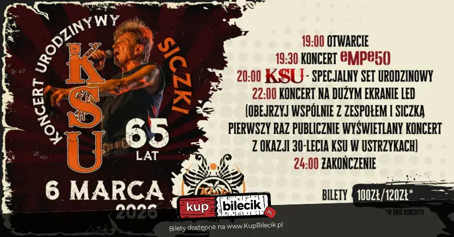 Zapraszamy 6 marca do Klubu Pod Palmą na koncert KSU z okazji 65 urodzin Siczki. Support: eMPe50. Bramy 19:00Start 19:30