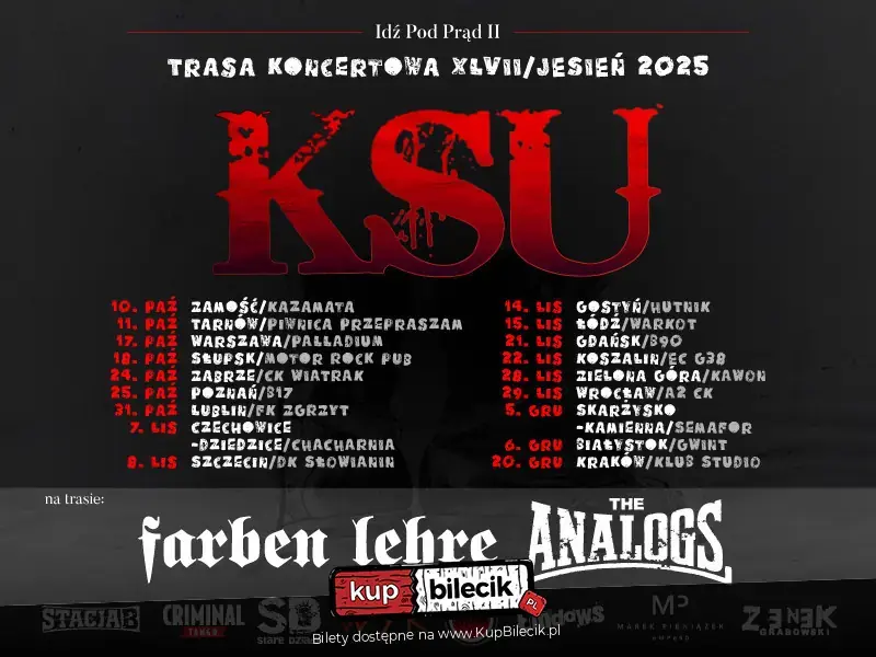 KSU wraca do JASIA WĘDROWNICZKA po 20 latach! W tym roku dokładnie 19stego marca Jaś Wędrowniczek świętuje 20 lat działalności. Dokładnie 20 lat temu na naszej scenie zagrało KSU. Dziś historia zatacza koło - KSU wraca do nas specjalnie na jubileusz 20-lecia Jasia Wędrowniczka. 14 marca (sobota) 2026GODZ: 19:00 Jaś Wędrowniczek38-480 Rymanów, ul. Bieleckiego 8 Support - ogłosimy wkrótce... Gościnnie: specjalna gwiazda światowego formatu basista grupy SCORPIONS Paweł Mąciwoda! BILETY: 120 zł - przedsprzedaż do 20 lutego 140 zł - po 20 lutego Z okazji jubileuszu na start koncertu lejemy GRATIS 2 beczki piwa. Bo takie święto zdarza się raz! To nie jest zwykły koncert.