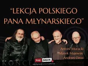 Koncert "Lekcja polskiego pana Młynarskiego" to spotkanie z polszczyzną najwyższej próby w wykonaniu artystów, którzy osobiście znali i współpracowali z Mistrzem - Antoni Muracki, Marek Bartkowicz, Marek Majewski i Piotr Golla. Wybrane pieśni tworzą kompletną opowieść o człowieku - od lirycznych uniesień, przez drapieżną satyrę, aż po niezwykle aktualne komentarze do naszej rzeczywistości. Każdy utwór to intymny, trzyminutowy teatr jednego aktora, łączący chirurgiczną precyzję tekstu z genialną warstwą muzyczną. To uniwersalna i do bólu szczera lekcja humanizmu, która bawi, wzrusza i zaspokaja oczekiwania najbardziej wymagającej publiczności.