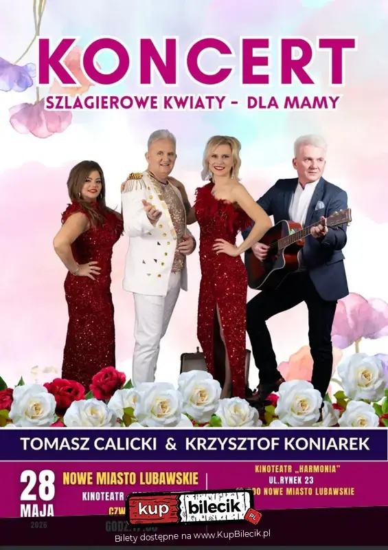 Któż z nas nie kocha swojej Mamy? Z okazji ich święta serdecznie zapraszamy na koncert "Szlagierowe Kwiaty dla Mamy". Czeka nas wieczór pełen emocji, wspaniałej, melodyjnej muzyki, pozytywnej energii i wzruszeń. Nie zabraknie także dobrego humoru, a o to wszystko zadbają artyści znani m.in. z anteny telewizji TVS oraz wielu rozgłośni radiowych : Krzysztof Koniarek z zespołem oraz zwycięzca Plebiscytu Hit Roku 2025 w TVS - Tomasz Calicki z zespołem.