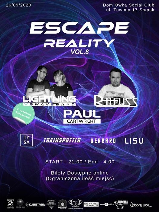 Z Wielką przyjemnością zapraszamy na 8 edycję imprezy Escape Reality, 26 września do Słupskiego Dom Ówka Social Club, na 3 urodziny kolektywu.