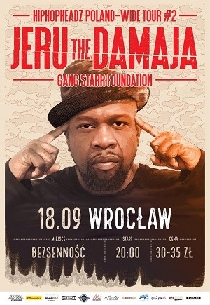 JERU THE DAMAJA od początku swojej kariery był mocno związany z grupą Gang Starr (Guru, DJ Premier) i był częstym gościem na ich płytach. Jego dwa pierwsze albumy w całości wyprodukował sam DJ Premier, który z całą pewnością jest najbardziej wpływowym producentem w historii rapu. Jeru należał do legendarnego składu Crooklyn Dodgers powołanego na potrzeby soundtrack'u do filmu Spike'a Lee “Clockers” (obok Jeru do składu należeli również: Masta Ace, Q-Tip (Tribe Called Quest), O.C. czy Buckshot). Twórczość Jeru można zaklasyfikować do świadomego rapu - jego teksty są przepełnione przekazem wiedzy i pozytywnych wartości. Poglądy Jeru bywają też kontrowersyjne, co doprowadziło do małego “beef'u” z grupą “The Fugees”, których zaczepkę w stronę Jeru można usłyszeć na albumie “The Score”. Wytwórnie Death Row oraz Bad Boy również nie były zadowolone z zarzutów Jeru o ich komercjalizacji. Od 2007 Jeru miał przerwę w muzycznych wydawnictwach, z wyjątkiem nagranego w Polsce utworu z Slums Attack (Peja, DJ Decks) i z O.S.T.R. Na trasie, oprócz starszych klasyków, będzie można usłyszeć utwory promujące najnowszy album Jeru “The Hammer”.