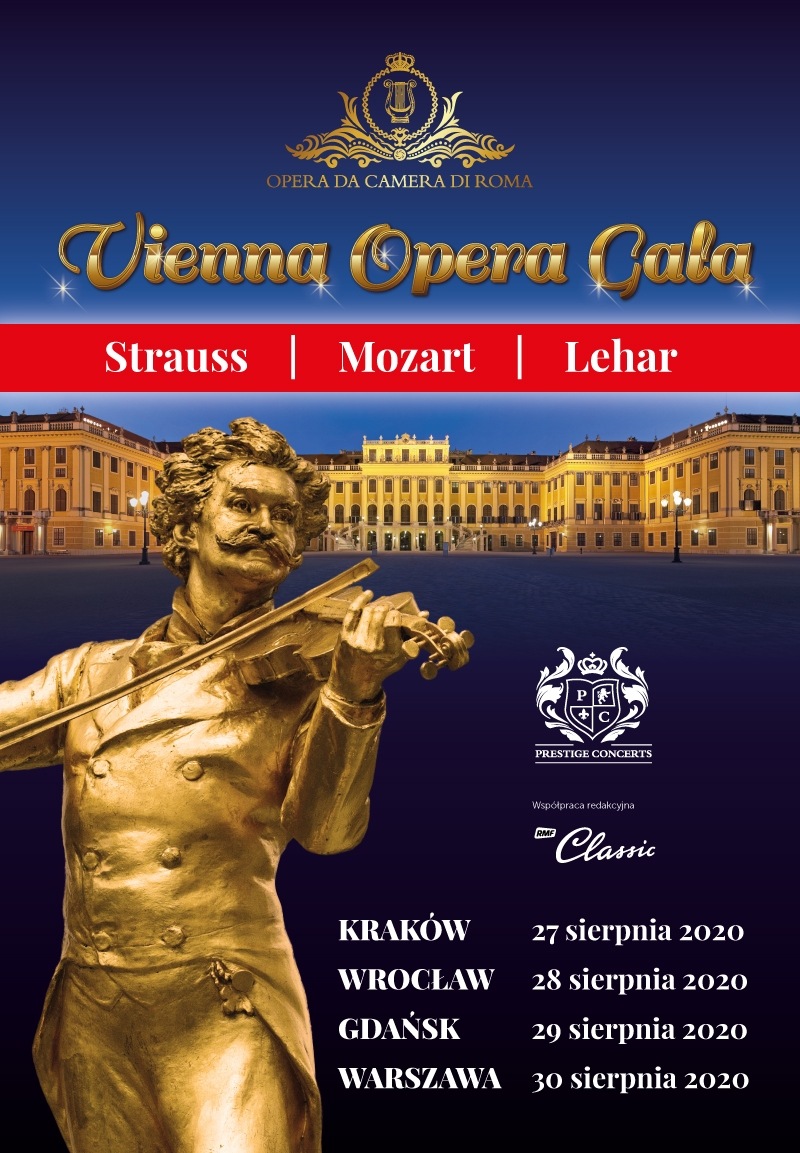KONCERT WIEDEŃSKI – Wiedeńska Gala Operowa Opera da Camera di Roma (Rzymska Opera Kameralna)* ma zaszczyt zaprosić na Koncert Wiedeński, podczas którego zaprezentowane zostaną najpiękniejsze arie z oper i operetek wiedeńskich oraz kanony instrumentalnej muzyki klasycznej wiedeńskich kompozytorów. Nasz koncert to połączenie radości, werwy i muzykalności włoskich i polskich solistów oraz klasycznej, wiedeńskiej formy i kunsztu instrumentalistów Rzymskiej Opery Kameralnej. Podczas koncertu zaprezentowane zostaną popisowe arie z najsłynniejszych oper i operetek: "Kraina Uśmiechu", „Księżniczka Czardasza", "Baron cygański", "Wesoła Wdówka", "Zemsta nietoperza". Usłyszymy hity instrumentalnej muzyki klasycznej jakie jak m.in. walc "Nad Pięknym Modrym...