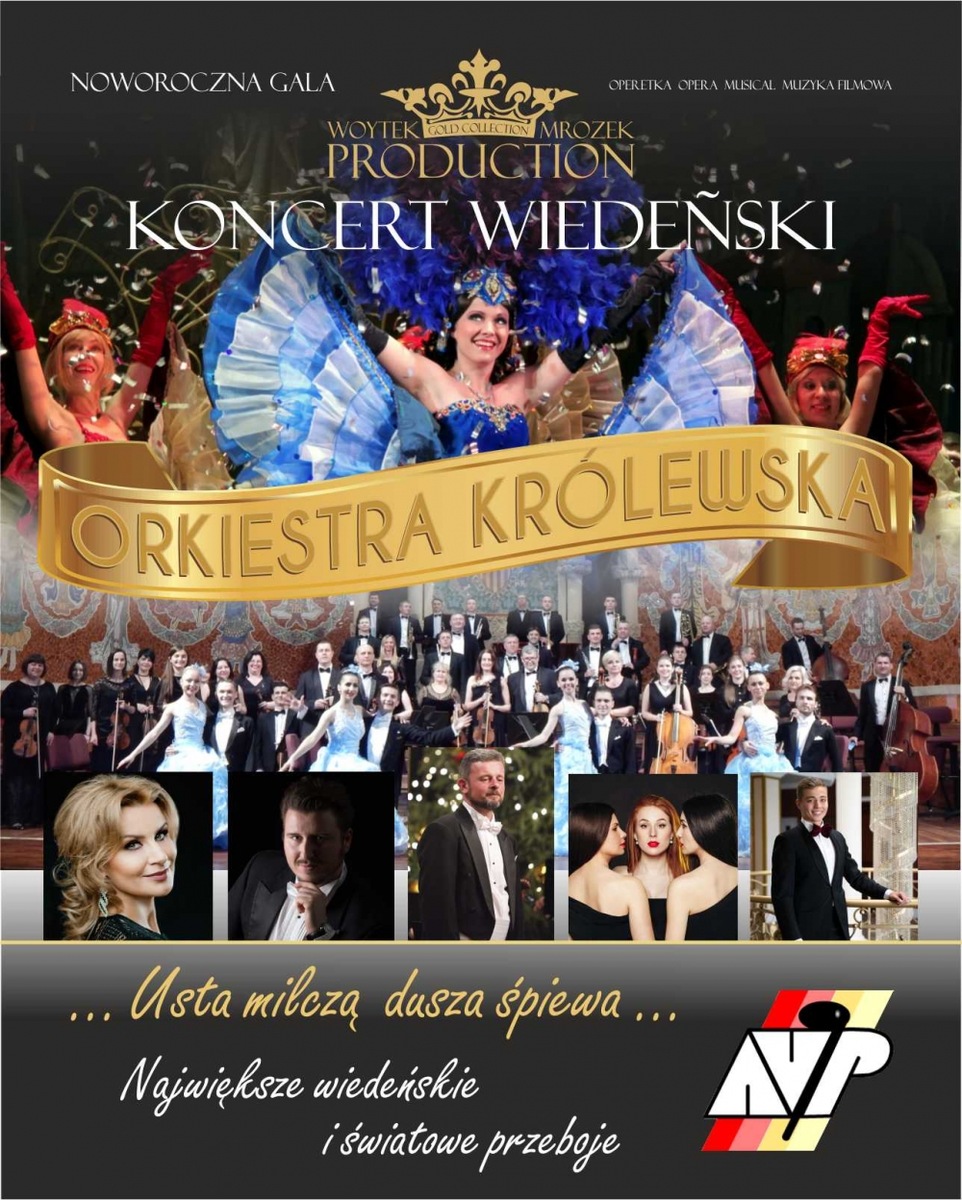 Koncert Wiedeński Orkiestra Królewska VIVA Wiedeń – VIVA Broadway Woytek Mrozek producent Myron Kril dyrygent Edyta Piasecka sopran Sławomir Naborczyk tenor Ladies Trio wokal Kenny Huster wokal Orkiestra Królewska Zapraszamy Państwa w podróż do roztańczonego i magicznego Wiednia, gdzie będą rozbrzmiewać najpiękniejsze arie, duety, walce i polki Johanna Straussa, Franca Lehara, Imre Kalmana oraz arie i duety wszech czasów oraz największe śwatowe szlagiery. Tegoroczny koncert w wykonaniu światowej Królewskiej Orkiestry pod dyrekcją znakomitego dyrygenta Miroslawa Krila – dyrektora artystycznego Filharmonii Tarnopolskiej oraz europejskiej klasy solistów międzynarodowych scen, przeniesie słuchaczy do ojczyzny walca i Nowego Jorku...
