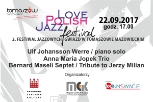 Love Polish Jazz Festival - druga edycja Festiwalu Jazzowych Gwiazd w Tomaszowie Mazowieckim zapowiada się wyjątkowo interesująco. Legendarny szwedzki saksofonista Göran Larsen przedstawi własne wizje polskich standardów jazzowych, Ulf Johansson Werre jeden z najbardziej wszechstronnych szwedzkich pianistów jazzowych zaprezentuje swoje kompozycje, a także jazzowe opracowania utworów Fryderyka Chopina. Z pewnością wyjątkowym koncertem będzie występ zespołu Bernarda Maselego (czterech wibrafonistów na jednej scenie!) - występ będzie zadedykowany Jerzemu Milianowi. Inne wielkie nazwiska polskiego jazzu dopełnią całości Love Polish Jazz Festival – Tomasz Stańko, Anna Maria Jopek i Hanna Banaszak. Serdecznie zapraszamy! Projekt realizowany we współpracy z Narodowym Centrum Kultury oraz Fundacją TM Innowacje.