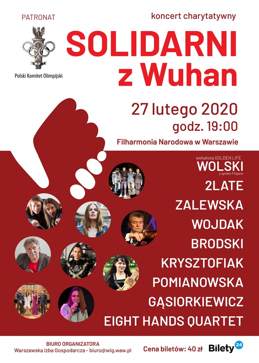 Koncert „Solidarni z Wuhan” - ruszyła sztafeta pomocy W obliczu zagrożenia epidemiologicznego wszyscy jesteśmy równi. Wirus nie zna granic, nie wybiera i atakuje tam, gdzie najmniej się tego spodziewamy, zwłaszcza najsłabszych. Nie omijajmy obojętnie problemu tylko dlatego, że zaistniał 8 tysięcy kilometrów od nas. W chwilach trudnych bądźmy solidarni! Charytatywna inicjatywa samorządu gospodarczego zyskuje znakomitych sojuszników. Patronat nad wydarzeniem – koncertem i akcją pomocy „Solidarni z Wuhan” – objął Polski Komitet Olimpijski! Organizacja świętowała w ubiegłym roku piękny jubileusz stulecia działalności na olimpijskim szlaku. Gratulujemy i serdecznie dziękujemy za wsparcie i obecność na koncercie. Na widowni Filharmonii Warszawskiej...