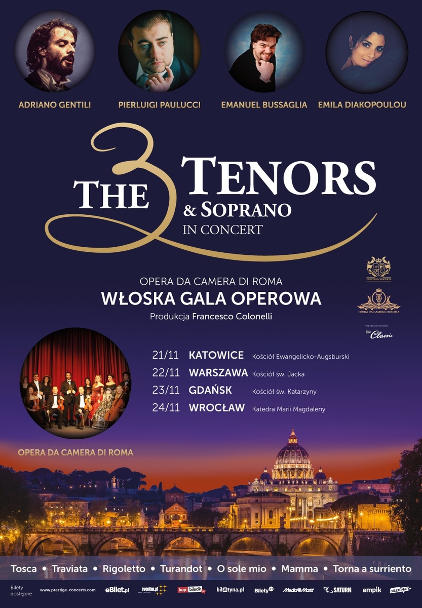Po sukcesie koncertów “The 3 Tenors & Soprano”, postanowiliśmy powtórzyć ten piękny koncert, który w 2018 i wiosną 2019 roku cieszył się ogromnym zainteresowaniem i uznaniem publiczności. Tym razem, podczas europejskiej trasy, artyści Opera da Camera di Roma zawitają do klimatycznych przestrzeni kościołów i katedr. Jesienią 2019 roku, ocieplimy te miejsca włoskim słońcem, gorącym temperamentem artystów i żarem emocji, których pełne są włoskie arie operowe. Wszystko to niesie ze sobą wyjątkowy koncert "The 3 Tenors & Soprano ", w którym wystąpią trzej utalentowani włoscy tenorzy oraz sopran, obdarzeni wyjątkową barwą głosu, gorącym, włoskim temperamentem i pogodą ducha. Emilia Diakopoulou, Adriano Gentili, Pierluigi Paulucci i Emanuel Bussaglia...