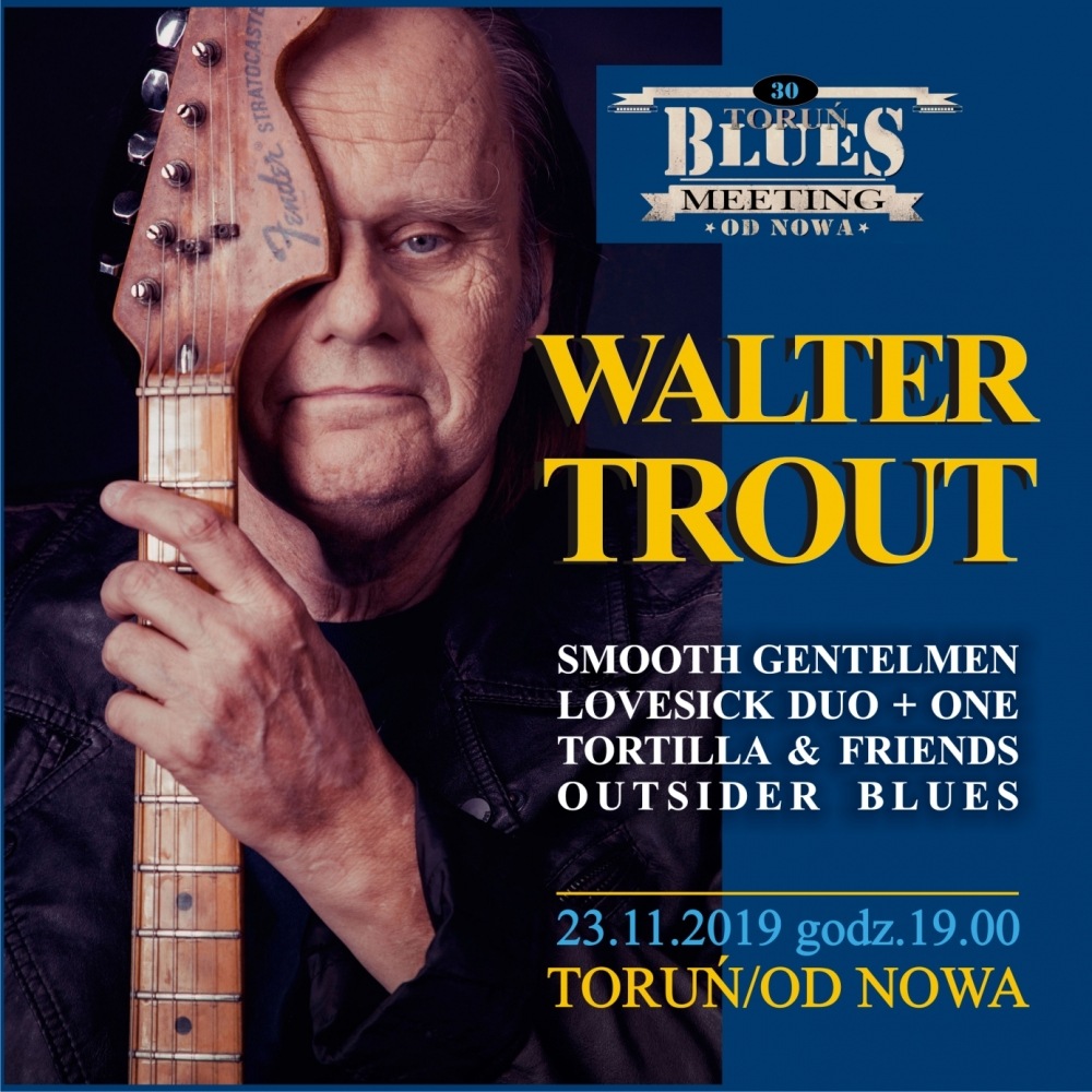 Walter Trout wraz ze swoim zespołem specjalnie przyleci na jeden koncert do Torunia by uświetnić 30 edycję Festiwalu TORUŃ BLUES MEETING. Walter Trout urodził się 6 marca 1951 roku w Atlantic City w stanie New Jersey (USA). Występował w lokalnych klubach Jersey. Jego kariera, jako muzyka nabrała rozpędu, kiedy to podjął decyzję o przeniesieniu się do Kalifornii. Zamieszkał w Los Angeles. Pierwszym zespołem z jakim się związał byli The Jive Bombers . Grupa grała muzykę country i nie był to ulubiony gatunek muzyczny Walktera. Dość szybko opuścił kolegów by jako sideman związać się z takimi wykonawcami jak Joe Tex, Percy Mayfield, „Pee Wee” Crayton, Gerge „Harmonica” Smith, John Lee Hooker czy samą „Big Mama” Thorton. Swoje pierwsze nagrania zarejestrował dopiero w roku 1972. Przełomem okazała się współpraca z formacją Canned Heat której był członkiem w latach 1980 - 1984. Owocem tej współpracy jest album koncertowy „Live in OZ”. Po odejściu od Canned Heat związał się na okres 5 lat Johnem Mayallem i jego Bluesbreakers. Warto zwrócić uwagę że w skład zespołu Johna Mayalla wchodził drugi gitarzysta Coco Montoya. Dialogi obu gitarzystów to znak rozpoznawczy tego okresu działalności Bluesbreakers. Ta współpraca dała kilka wspólnych płyt. Ale to co najważniejsze - dała Walerowi Troutowi pewność iż może rozpocząć karierę solową. Opuszcza zespól Johna Mayalla w roku 1989. W 1989 zakłada swój pierwszy zespól pod nazwą Free Radicals. Ich pierwszy album py „Life in The Jungle” pojawił się w 1989 roku. Rok później czyli w 1990 roku zmienia nazwę grupy na The Radicals. Na swojej Europejskiej trasie w Holandii – w Amsterdamskim klubie Paradiso album - Live Trout (2000). Krążek staje się sukcesem I artystycznym I komercyjnym. Dostaje się na 15 miejsce listy Billbordu a singiel z tej płyty z utworem Go the distance trafia na 10 miejsce listy przebojów. W roku 2002 zostaje zaproszony przez Bo Diddleya do nagrania płyty hołdu dla Bo DIDDLEYA. - HEY BO DIDDLEY - A tribute. Nagrany przez W TROUTTA utwór „Road Runner’ staje się przebojem. Rok 2013 jest kolejnym ważnym momentem w karie ze artysty, Album W Trio = LUTHER’S Blues został nominowany Do nagrody BLUES MUSIC AWARD w kategorii Rock Blues Album of the Year. Rok 2013 zapisał się również mniej pozytywnie w życiorysie W Trouta. Ponieważ podczas turystycznej wyprawy po Europie trafił do szpitala a tam zdiagnozowano u niego chorobę wątroby. Problem na tyle poważny iż lekarze zawyrokowali iż Artysta musi w przeciągu 90 dni poddać się przeszczepowi wątroby. Zbiórka pieniężna wśród fanów dała pozytywny efekt i artysta mógł się poddać przeszczepowi wątroby. Rok 2015 to powrót W Trouta do aktywności i koncertowej oraz wydawniczej. Efektem tej drugiej jest wręcz biograficzny album „Battle Scars”, w którym autor opisuje swoją walkę z chorobą. W 2016 Walter Trout odebrał dwie ważne nagrody. Pierwsza Blues Music Awards za utwór roku - „ Gonna live Again” Druga nagroda przypadła mu za cały album. Albumen bluesowym roku 2015 uznany został Batlle Scars. Niezwykle ważna w dorobku Waltera Trouta jest płyta „We’ra All in this Together” wydana w 2017 roku. Do nagrania albumu gitarzysta zaprosił same znakomitości bluesowe. Zagrali miedzy innymi Kenny Wayne Shepherd, Charlie Musselwhite, Roben Ford, Joe Bonamassa i jego dawny nauczyciel sam John Mayall. Na taki zestaw nazwisk wskazuje jakim szacunkiem i estymą obdarzony jest Walter Trout. Od tego momentu Walter Trout na czele swojego zespołu przemierza Stany oraz niezwykle często odwiedza Europe. Ostatni album wydany na początku 2019 roku okupuje czołowe miejsca najlepiej sprzedawanych bluesowych krążków Po obu stronach Atlantyku.