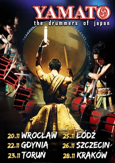 Po spektakularnym sukcesie trasy w 2014 roku, niemal po dwuletniej przerwie, specjalnie na prośbę Widzów, do Polski powróci zespół, który cieszy się uznaniem na całym świecie – Yamato! Najbardziej znani japońscy bębniarze świata powracają do nas ze swoim najnowszym show już w listopadzie bieżącego roku. Ogromna dawka optymizmu, dreszcze emocji i jedyne w swoim rodzaju oryginalne brzmienia Dalekiego Wschodu – to wszystko gwarantuje rewelacyjne przedstawienie w wykonaniu japońskiej grupy YAMATO. Wydobywane przez muzyków dźwięki inspirowane są tradycyjną muzyką japońską, ale stanowią jej współczesne, przewrotne wariacje. Każdy z artystów prowadzi własne kabaretowo-teatralne show. Zapierające dech w piersiach solowe popisy przeplatają się z fenomenalnymi, transowymi utworami zbiorowymi. W występ zaangażowana jest cała publiczność – widzowie klaszczą, wspólnie wybijają rytm, powtarzają zagrane na bębnach takty. Wszystkich, którzy chcą naładować się niesamowitą dawką energii podczas zimnej, polskiej jesieni zapraszamy na niezapomniane show do Wrocławia, Gdyni, Torunia, Łodzi, Szczecina oraz Krakowa.