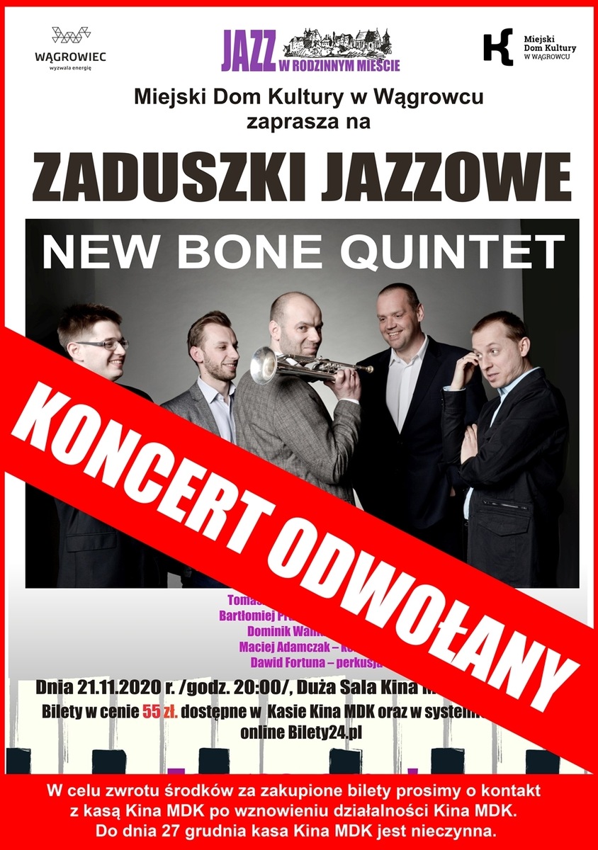 Wydarzenie "ZADUSZKI JAZZOWE - Koncert New Bone Quintet" z dnia 21.11.2020 20:00 zostało odwołane!