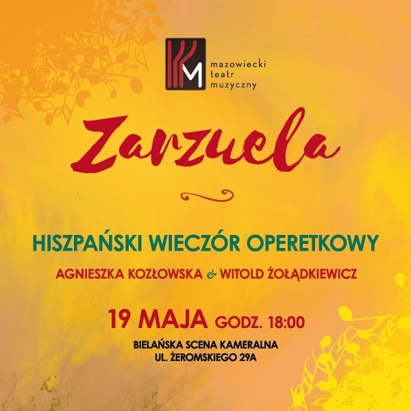 Zarzuela to tradycyjny, bardzo popularny w Hiszpanii gatunek muzyczny będący odpowiednikiem operetki i opery komicznej. Charakterystyczne dla niego pełne temperamentu rytmy i śpiewne melodie zawierają w sobie łatwo rozpoznawalny, iberyjski charakter. Agnieszka Kozłowska (sopran) oraz Witold Żołądkiewicz (baryton), zaprezentują rzadko wykonywane w Polsce arie i duety, największe przeboje hiszpańskiej zarzueli. Koncert uzupełnią popularne utwory gitarowe w wykonaniu wirtuoza tego instrumentu Aleksandra Wilgosa. Gospodarzem wieczoru będzie czołowy spiker Polskiego Radia i znany konferansjer Andrzej Krusiewicz.