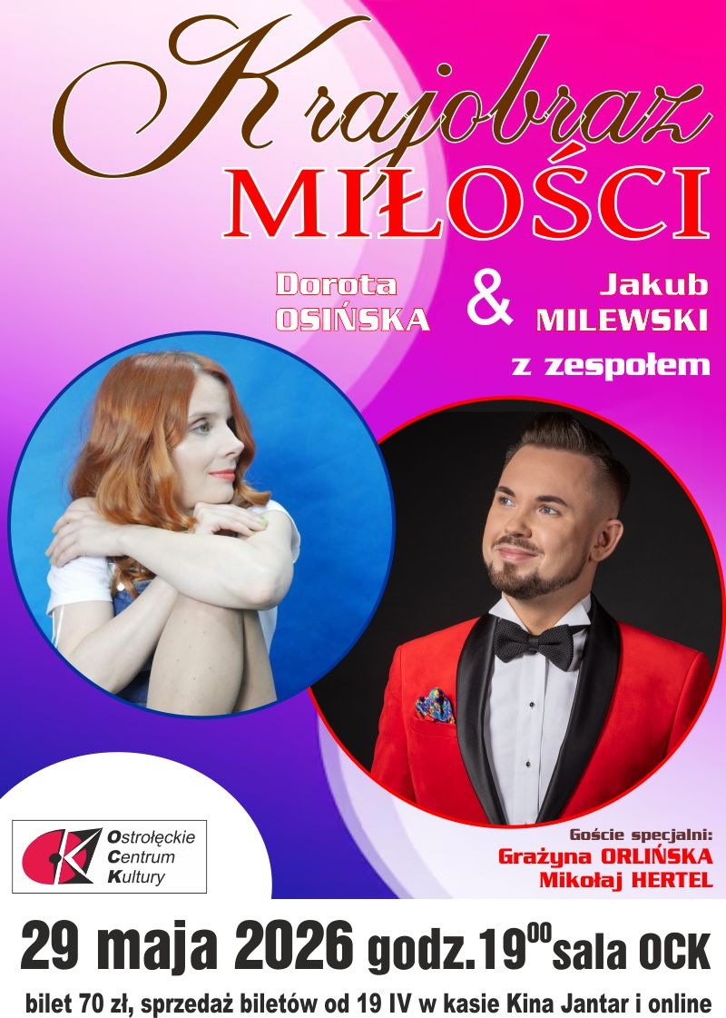 Zapraszamy w piątek 29 maja o godzinie 19:00 na salę widowiskową Ostrołęckiego Centrum Kultury na wyjątkowy koncert „Krajobraz miłości”! Dorota Osińska i Jakub Milewski zaprezentują się przed ostrołęcką publicznością w prawdziwym zderzeniu muzycznych światów – liryczny i niezwykle ciekawy wokal polskiej estrady oraz ciepły i otulający baryton śpiewaka operowego. Takiego duetu polska scena dawno nie widziała!