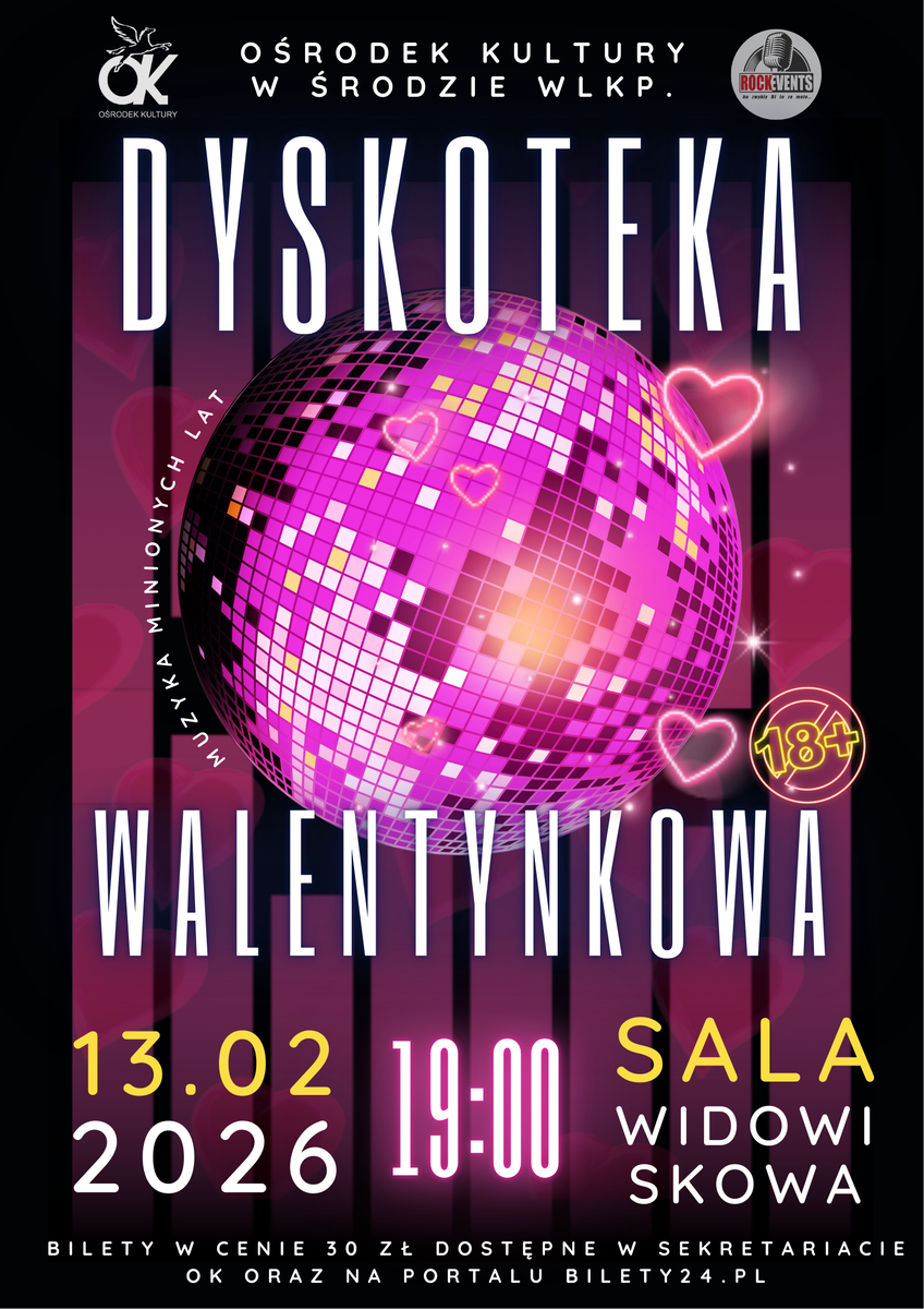 W przeddzień święta zakochanych zapraszamy na gorącą DYSKOTEKĘ WALENTYNKOWĄ w rytmie minionych lat!Serdecznie zapraszamy wszystkich zakochanych i niezakochanych, w parach i nie w parach na coroczną dyskotekę walentynkową.Data: 13.02.2026 (piątek)Start: 19:00 (Otwarcie drzwi o 18:30)Miejsce: Ośrodek Kultury (ul. 20 Października 30, Środa Wlkp.)Muzyka minionych lat, przygotowana specjalnie na tę okazję!Zagra: Rock EventsStoisko z przekąskami: Restauracja Turystyczna u MonikiNie gwarantujemy miejsc siedzących.