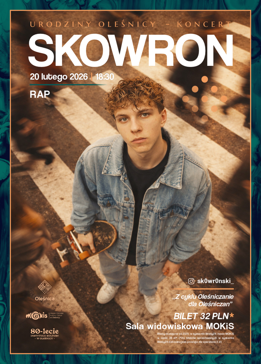 Miejski Ośrodek Kultury i Sztuki w Oleśnicy zaprasza na koncert SKOWRONA, który odbędzie się z okazji URODZIN OLEŚNICY 20 lutego o godz. 18:30 w Sali widowiskowej MOKiS. Bilety w cenie 30*zł w sprzedaży od 23.01.2026 r. (*do biletów sprzedawanych w systemie Bilety24 doliczana jest prowizja dla operatora 2 zł). Cena biletów w kasie MOKiS 32 zł.