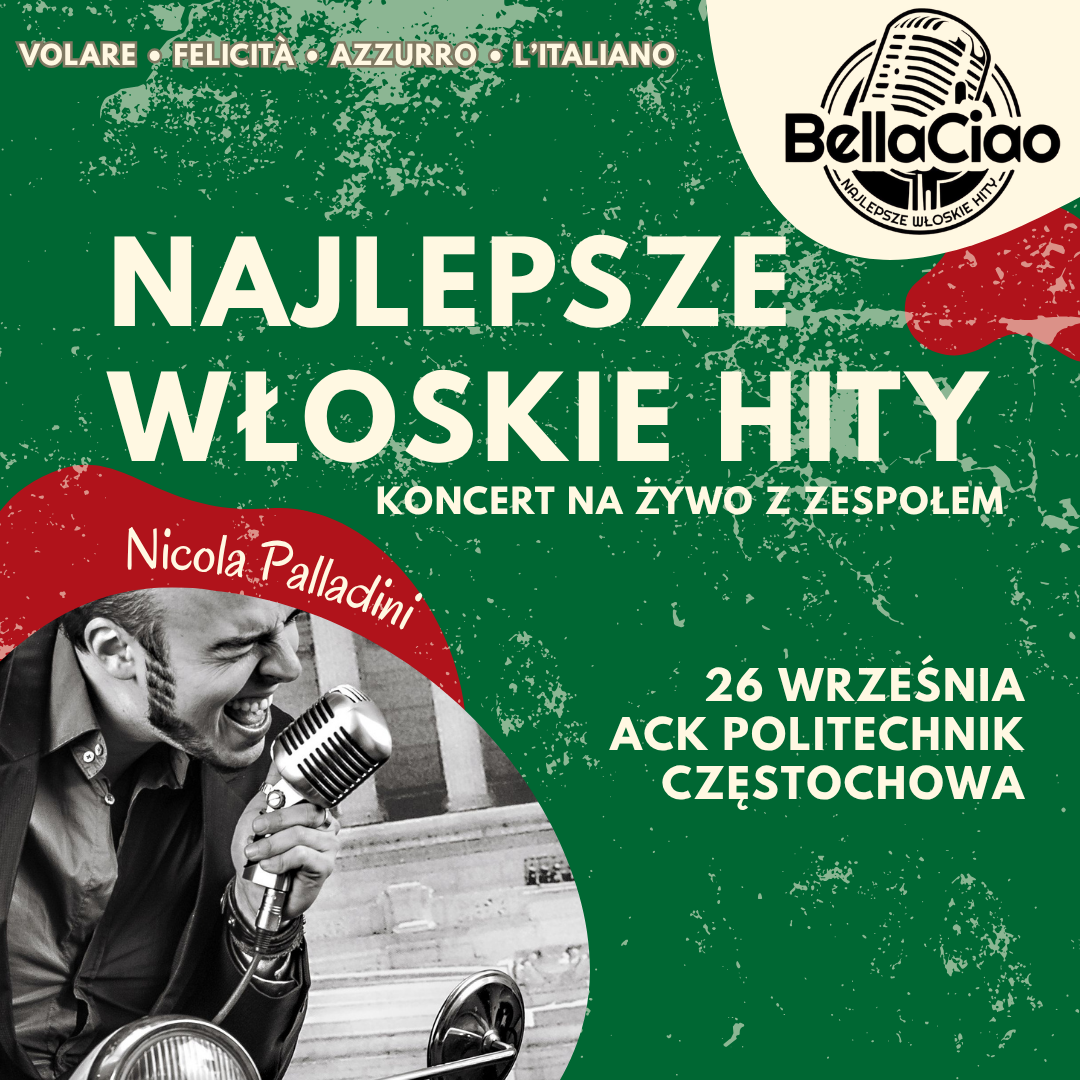 Włoski wokalista i aktor musicalowy Nicola Palladini wraz z zespołem zabiera publiczność w wieczór największych włoskich hitów, które od lat podbijają serca słuchaczy.