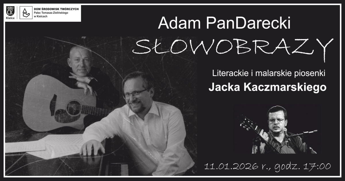 Zapraszamy na niezwykły wieczór, który przeniesie publiczność w świat słów, obrazów i muzyki. Słowobrazy to oryginalny projekt duetu Adam PanDarecki, w którym twórczość Jacka Kaczmarskiego nabiera nowego, głębszego wymiaru. Artyści nie sięgają po najbardziej znane utwory barda – wybierają te, które pozostają na uboczu głównego nurtu, a jednocześnie skrywają w sobie ogrom energii, emocji i znaczeń. Koncert staje się swoistą podróżą przez kulturę, historię i sztukę. Każda piosenka poprzedzona jest krótką, wciągającą opowieścią – literackim lub malarskim kontekstem, który pozwala lepiej zrozumieć świat, do którego odwoływał się Kaczmarski. Towarzyszący muzyce pokaz dzieł sztuki dopełnia całości, sprawiając, że odbiorca słucha, ogląda i interpretuje równocześnie. To koncert, który działa na wiele zmysłów i skłania do refleksji. Brzmienie projektu jest kameralne, a jednocześnie niesamowicie nasycone emocjami. Delikatna, folkowa gitara przeplata się z mocnym, rockowo-bluesowym fortepianem, budując przestrzeń, w której słowa zyskują wyjątkową intensywność. Artyści tworzą atmosferę bliskości i szczerości – ich interpretacje są pełne autentyzmu, szacunku dla tekstu i osobistego zaangażowania.