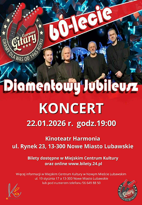 Czerwone Gitary 60-lecie Diamentowy Koncert. Czerwone Gitary należą do grona nielicznych zjawisk muzycznych, które stały się klasyką polskiej kultury popularnej. Diamentowy Koncert będzie przypomnieniem największych przebojów ze wszystkich płyt Zespołu. Ta (dwugodzinna) muzyczna wędrówka z niezapomnianymi hitami i nowymi piosenkami Zespołu, będzie gwarancją wspomnień, wzruszeń i zapowiedzią fantastycznej integracji widzów z Zespołem. Kilkudziesięcioletnia, konsekwentna praca Czerwonych Gitar i umiejętności odmłodzonego składu Czerwonych Gitar zostały docenione na Jubileuszowej trasie 55-lecia, która odniosła olbrzymi sukces. Do zobaczenia na Diamentowej trasie koncertowej, 60-lecia Zespołu! Czerwone Gitary tworzą: Jerzy Skrzypczyk - perkusja, śpiew, Mieczysław Wądołowski - gitara akustyczna, śpiew, Arkadiusz Wiśniewski (gitara basowa, śpiew, aranżacje) i Marcin Niewęgłowski - gitara solowa, śpiew.