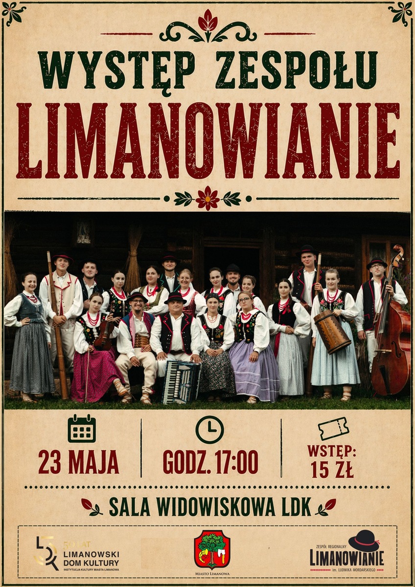 „Limanowianie” zabiorą Was w świat żywej tradycji – pełnej muzyki, tańca i emocji. To nie muzeum, to kultura, która dzieje się tu i teraz – na scenie.