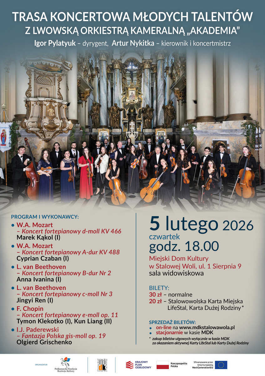 Jeśli mamy początek lutego, to w MDK powinniśmy się spodziewać corocznej wizyty delegacji z Sanoka reprezentującej Międzynarodowe Forum Pianistyczne „Bieszczady bez granic”. Stalowa Wola 5 lutego znalazła się na „Trasie koncertowej Młodych Talentów”. Artyści wyruszają z Sanoka razem z Lwowską Orkiestrą Kameralną „Akademia” pod dyrekcją Igora Pylatyuka, by zdobywać praktykę sceniczną i budować relacje z publicznością. Dla nas jest to okazja do kontaktu z muzyką klasyczną na najwyższym poziomie oraz twórczością najwybitniejszych kompozytorów.