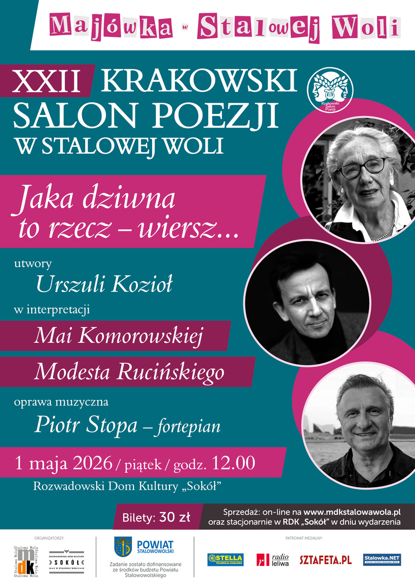W tym rozgaszczaniu się podczas XXII Krakowskiego Salonu Poezji w Stalowej Woli pomogą nam wybitni aktorzy – Maja Komorowska, uwielbiana przez studentów profesor sztuk teatralnych, bohaterka książki Barbary Osterloff „Pejzaż. Rozmowy z Mają Komorowską dawne i nowe”, oraz Modest Ruciński, w 2013 roku uhonorowany tytułem Ambasadora Stalowej Woli. Muzycznie przez majówkowe spotkanie przeprowadzi nas pianista – Piotr Stopa.