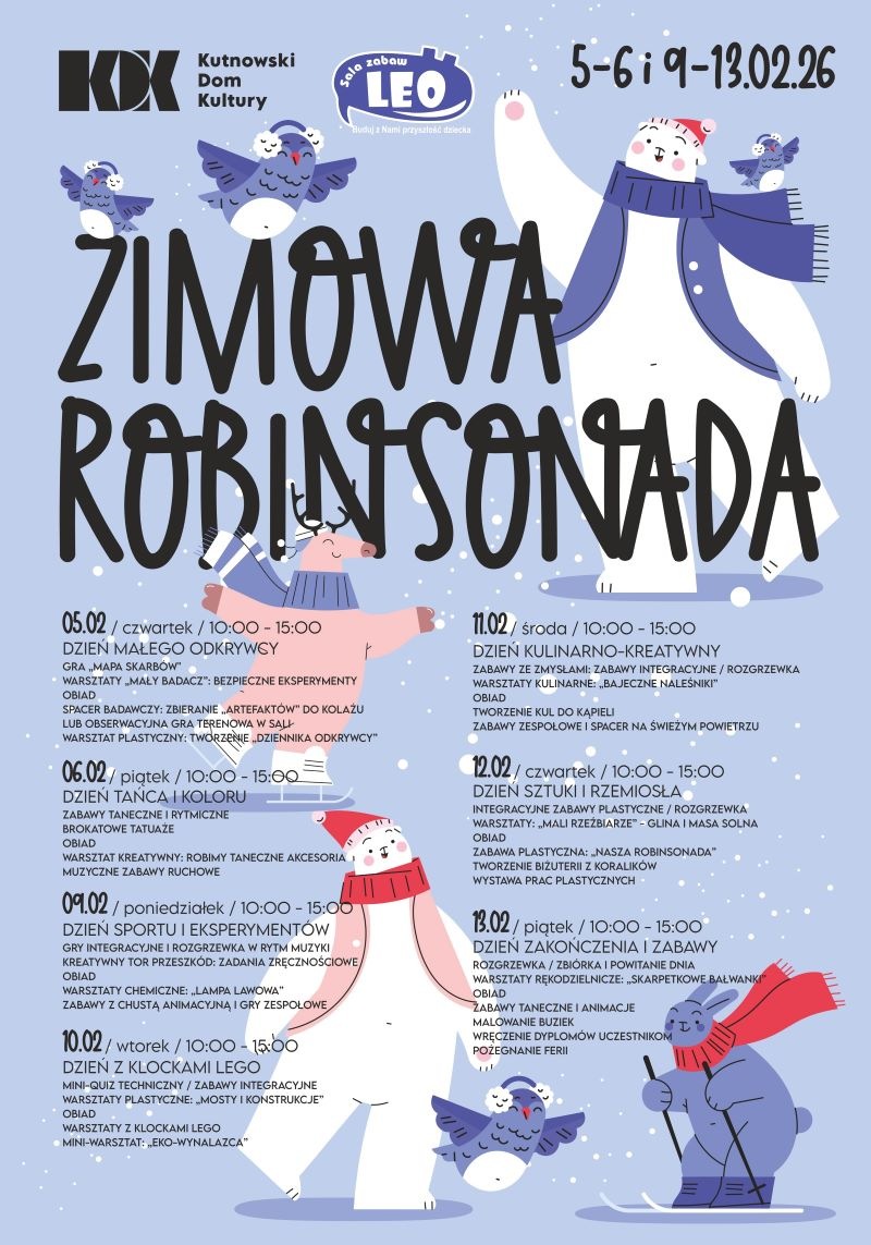 Zapraszamy na Zimową robinsonadę z LEO - ferie pełne energii, śmiechu i kreatywnych przygód. Przez 7 dni (można też wybrać pojedynczy, pasujący termin) zajęć dzieci zanurzą się w świat zimowych zabaw, warsztatów i niespodzianek. Będzie śnieżna kraina, śmiech, ruch i masa rękodzieła.