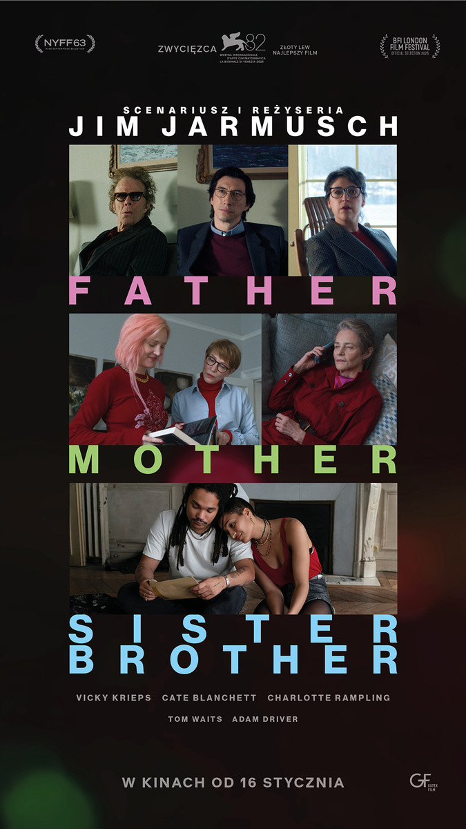 „FATHER MOTHER SISTER BROTHER" to zwycięzca ostatniego festiwalu w Wenecji i najlepszy od lat film Jima Jarmuscha, twórcy „Patersona" i „Broken Flowers". Pełen błyskotliwych obserwacji precyzyjnie skomponowany tryptyk filmowy o relacjach rodzinnych i o tym, co sprawia, że się od siebie oddalamy.Każdy z trzech rozdziałów rozgrywa się współcześnie, w innym kraju: FATHER – w północno-wschodnich Stanach Zjednoczonych, MOTHER – w Dublinie, a SISTER BROTHER – w Paryżu. Film Jarmuscha stanowi zbiór subtelnych, pełnych humoru, ale i nut melancholii portretów ludzkich charakterów. W rolach głównych m.in. Cate Blanchett, Adam Driver, Tom Waits, Vicky Krieps i Charlotte Rampling.Sam reżyser tak mówi o swoim najnowszym filmie: „FATHER MOTHER SISTER BROTHER" to w pewnym sensie zaprzeczenie kina akcji. Jego wyciszony styl został świadomie ukształtowany po to, by pozwolić widzowi dostrzec drobne szczegóły – niczym starannie ułożone trzy kompozycje kwiatowe. Współpraca z wybitnymi operatorami Frederickiem Elmesem i Yorickiem Le Saux, znakomitym montażystą Affonso Gonçalvesem oraz innymi stałymi współpracownikami pozwoliła nam wynieść to, co początkowo istniało jedynie jako słowa na kartce papieru do rangi czystego kina.